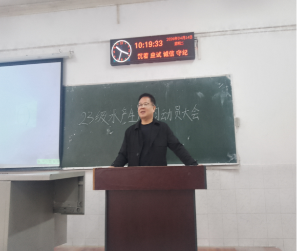 4月14日上午,长江大学动物科学技术学院水产系在西校区5教201教室召开2023级水产养殖学专业2026年生产实习动员大会。学院副院长杨烨、实习指导教师胡伟、黄孝锋、方刘、罗鸣钟、罗凯及2023级水产养殖学全体同学参加会议,会议由水产系主任易提林主持。