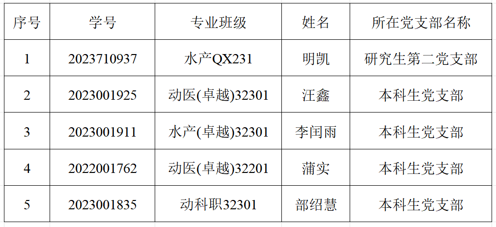 经党支部培养教育和考察,在听取培养联系人、党员和群众意见的基础上,经支部大会会议讨论决定并报学院党委备案同意,2025年9月22日确定明凯等5名同志为发展对象。为保证发展新党员的质量,加强对发展党员工作的民主监督,现对拟发展对象进行公示。 公示时间:2025年9月23日至2025年9月29日。公示期间,党员和群众均可通过来信、来电、来访等形式反映公示对象在理想信念、政治立场、思想作风、学习和工作表现、群众观念、廉洁自律等方面的情况和问题。反映问题应当实事求是、客观公正,反对借机诽谤诬告。以个人名义反映问题的,提倡署报本人真实姓名,以便调查核实,党支部将对反映人信息将严格保密。 联系方式: 长江大学动物科学技术学院本科生党支部:0716 8066290(联系电话); dkxydw2024@163.com(邮箱) 长江大学动物科学技术学院研究生第二党支部:0716 8066290(联系电话); dkxydw2024@163.com(邮箱) 长江大学动物科学技术学院党委: 0716 8061776(联系电话); dkxydw2024@163.com(邮箱) 中共长江大学动物科学技术学院委员会 2025年9月22日 附:拟确定明凯等5名同志为发展对象基本情况一览表