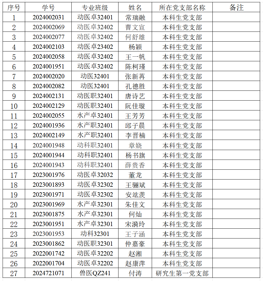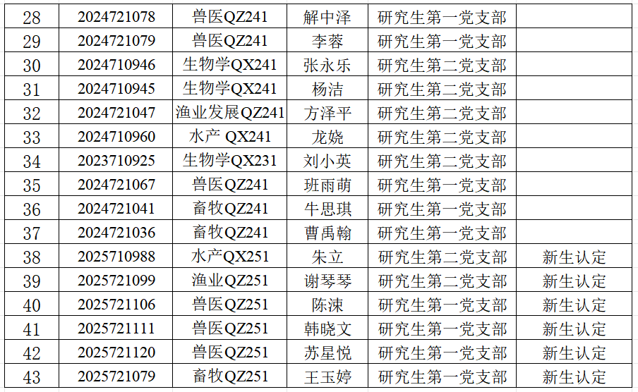 根据党员推荐和团组织推优情况,经支部大会会议讨论决定并报长江大学动物科学技术学院党委备案,确定常瑞融等43名同学为入党积极分子,现予以公示。公示时间:2025年9月16日至2025年9月22日。 公示期间,党员和群众均可通过来信、来电、来访等形式反映公示对象在政治表现、道德品质、工作学习、遵纪守法和社会公德及廉洁自律等方面存在的问题和情况。反映问题应当实事求是、客观公正,反对借机诽谤诬告。以个人名义反映问题的,提倡署报本人真实姓名,以便调查核实,党支部将对反映人信息将严格保密。 联系方式:长江大学动物科学技术学院本科生党支部:0716 8066290(联系电话); dkxydw2024@163.com(邮箱) 长江大学动物科学技术学院研究生第一党支部:0716 8066243(联系电话); dkxydw2024@163.com(邮箱) 长江大学动物科学技术学院研究生第二党支部:0716 8066290(联系电话); dkxydw2024@163.com(邮箱) 长江大学动物科学技术学院党委: 0716 8061776(联系电话); dkxydw2024@163.com(邮箱) 中共长江大学动物科学技术学院委员会 2025年9月15日 附:拟确定常瑞融等43名同志为入党积极分子基本情况一览表