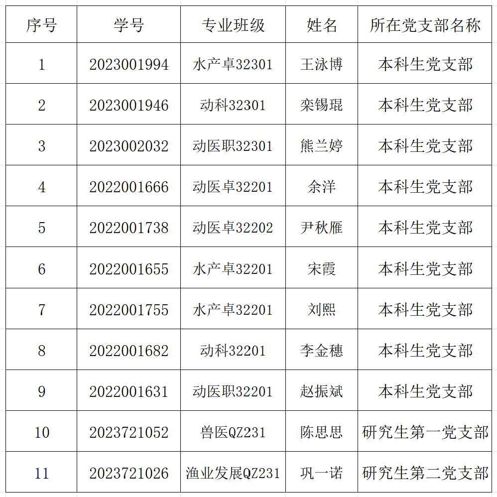 经过党支部对预备党员1年的培养教育和考察,经支部委员会研究确定,报分党委审查同意,将于近期召开党员大会讨论王泳博等11名同志预备党员转正,特在学院范围内进行公示。 欢迎广大师生员工在公示期内,根据公示对象的政治表现、道德品质、工作学习、遵纪守法和社会公德及廉洁自律、培养教育等方面的情况,对照党员条件(党章第一条至第四条),通过来电、来函或直接向校党委组织部反映公示对象存在的不符合党员条件、不宜转正的问题。反映的情况,要有事实依据。 公示时间:2025年11月15日至2025年11月21日。 联系方式: 长江大学动物科学技术学院本科生党支部:0716 8066290(联系电话); dkxydw2024@163.com(邮箱) 长江大学动物科学技术学院研究生第一党支部:0716 8066243(联系电话); dkxydw2024@163.com(邮箱) 长江大学动物科学技术学院研究生第二党支部:0716 8066243(联系电话); dkxydw2024@163.com(邮箱) 长江大学动物科学技术学院党委: 0716 8061776(联系电话); dkxydw2024@163.com(邮箱) 中共长江大学动物科学技术委员会 2025年11月14日 附:王泳博等11名同志预备党员拟转正情况一览表