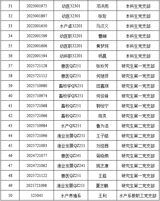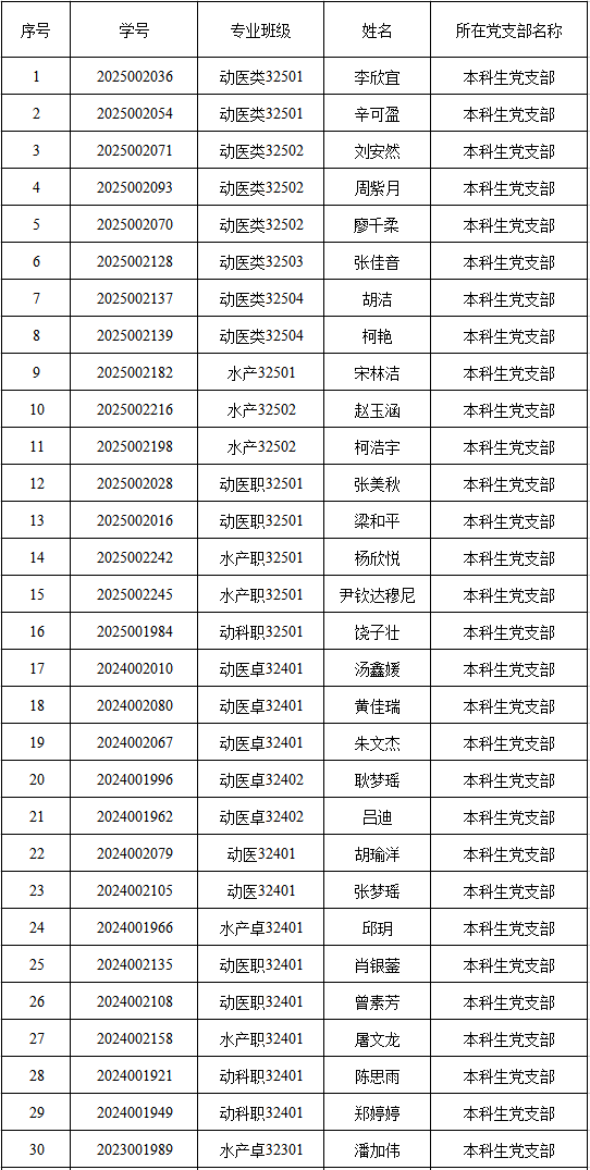 根据党员推荐和团组织推优情况,经支部委员会会议讨论决定并报长江大学动物科学技术学院党委备案,确定李欣宜等50名同学为入党积极分子,现予以公示。公示时间:2026年3月22日至2026年3月26日。 公示期间,党员和群众可来信、来电、来访,反映公示对象在理想信念、政治立场、思想作风、学习和工作表现、群众观念、廉洁自律等方面的情况和问题。反映问题应当实事求是、客观公正,反对借机诽谤诬告。以个人名义反映问题的,要签署本人真实姓名。学院党委将对反映人信息严格保密,对所反映的问题将作认真调查核实。 联系方式: 长江大学动物科学技术学院本科生党支部:0716 8066290(联系电话); dkxydw2024@163.com(邮箱) 长江大学动物科学技术学院研究生第一党支部:0716 8066256(联系电话); dkxydw2024@163.com(邮箱) 长江大学动物科学技术学院研究生第二党支部:0716 8066243(联系电话); dkxydw2024@163.com(邮箱) 长江大学动物科学技术学院水产系教职工党支部:0716 8066243(联系电话); dkxydw2024@163.com(邮箱) 长江大学动物科学技术学院党委: 0716 8061776(联系电话); dkxydw2024@163.com(邮箱) 中共长江大学动物科学技术学院委员会 2026年3月21日 附:拟确定李欣宜等50名同志为入党积极分子基本情况一览表