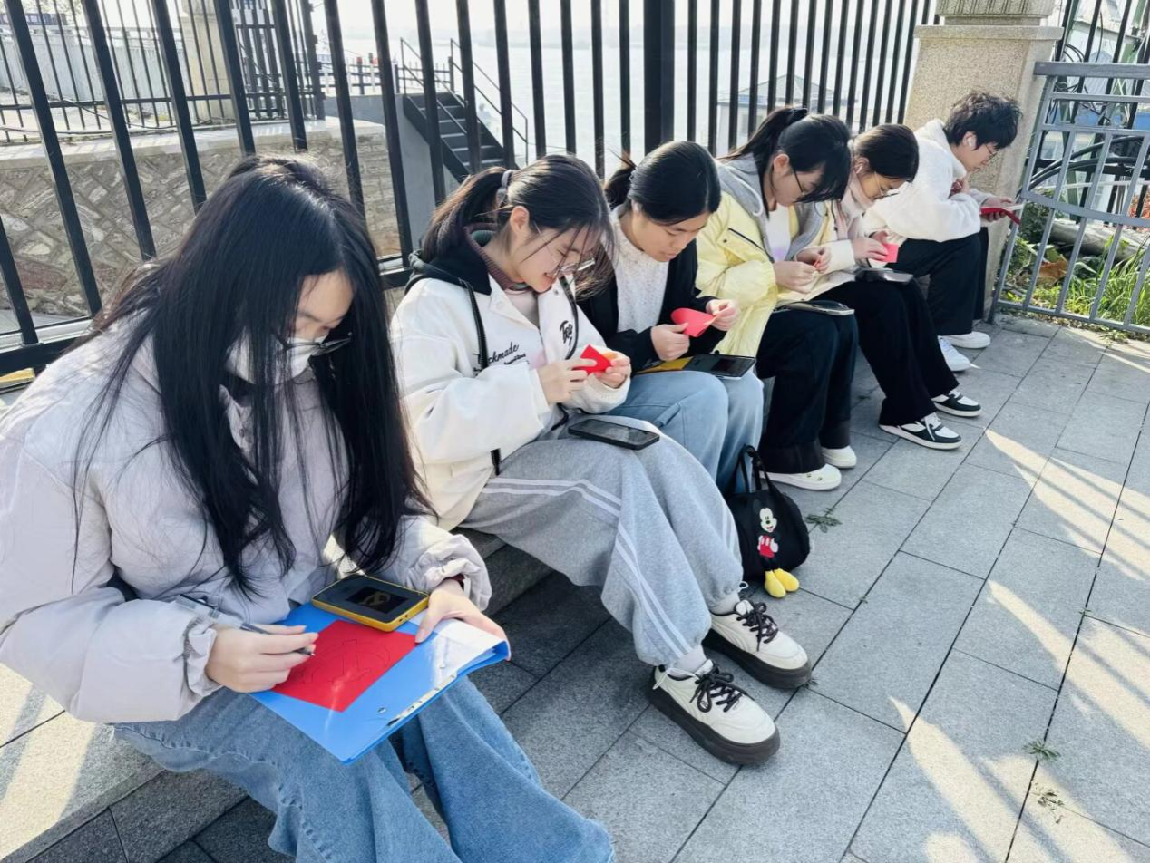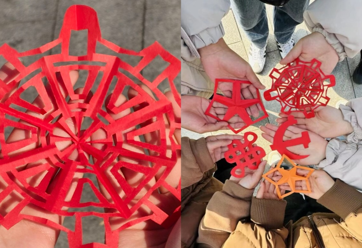 “窗花寄情·传承经典”环节,则是一场艺术与情感的交融。在学院心育部成员的带领下,大家手持剪刀、彩纸,围绕“爱国”“传承”“青春”主题,精心创作剪纸作品。党徽、团徽、五角星等图案在指尖跃动,每一剪都蕴含着对祖国的深情厚谊,每一张都承载着对红色经典的传承与发扬。