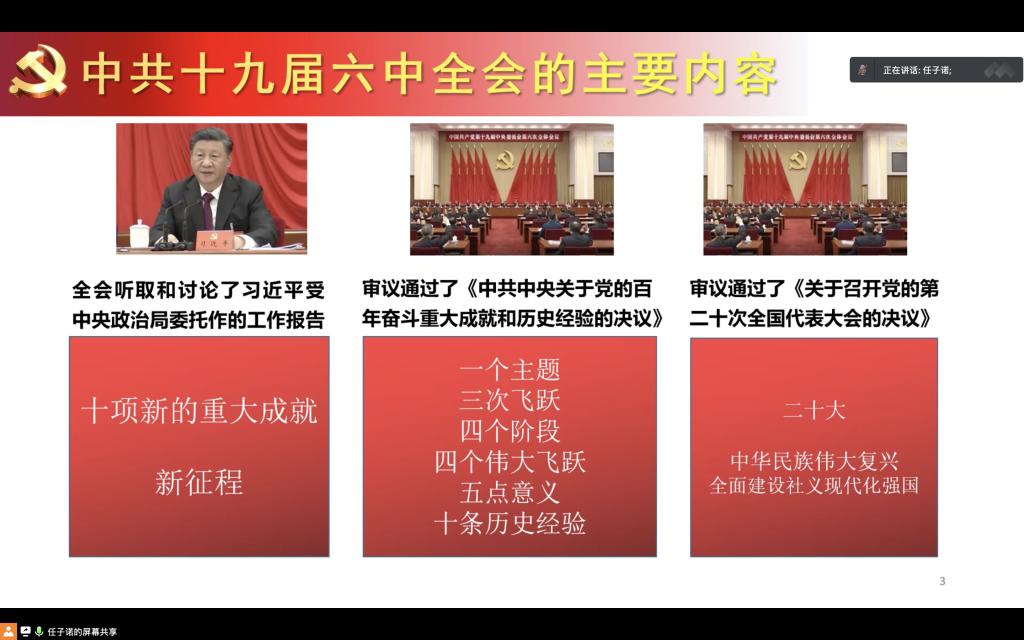 (通讯员:黄玲玲 吴广)4月21日中午2时,动科学院在线上开展以“勿忘昨天,无愧今天,不负明天”为主题的中共十九届六中全会相关内容的学习活动。参与本次活动的有:动科学院青马学习小组全体成员、20级与21级各班的团支书以及20级的预备党员。本次活动由学习科创部部长任子诺担任主讲人,同时还邀请到了团委书记王海洋老师。