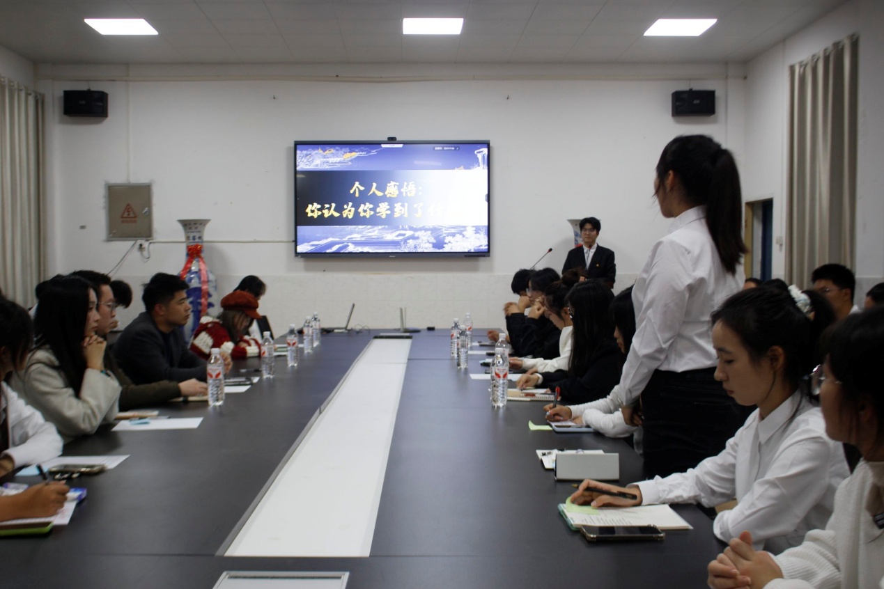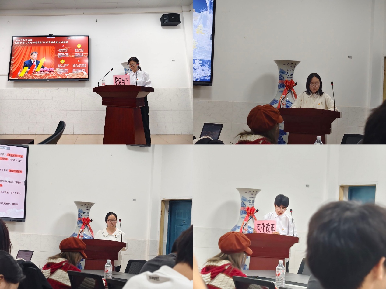 在青年解读环节,四位小组代表依次登台,深度解读习近平总书记重要论述。李缨筠同学带领学习习近平总书记在中华人民共和国成立76周年招待会上的讲话,系统梳理76年来党领导人民取得的彪炳史册的成就,强调要聚焦当下工作、坚守“一国两制”、维护祖国统一、推动构建人类命运共同体;李俊杰同学围绕习近平总书记给天津大学全体师生的回信,提出青年学子需紧扣时代与国家需求踔厉奋发,高校应锚定国家重大战略,深化教学科研改革、强化基础研究与科研攻关、提升人才培养质量;鞠沁宸同学代表解读中央政治局第二十二次集体学习讲话要点,明确推进宗教中国化必须坚守党的领导、融合中华优秀传统文化、依法治理宗教事务、激发宗教界自我变革活力;汪鑫同学代表领学《求是》杂志刊发的习近平总书记重要文章《中华民族共同体的形成和发展是人心所向,大势所趋、历史必然》,强调中华民族血脉相融、文化相通、信念相同、经济相依、情感相亲,号召全体青年持续铸牢中华民族共同体意识。学习尾声,李梦涵、辛可盈等同学分享个人感悟,引发全场共鸣。