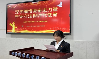 为深入学习贯彻党的二十届四中全会精神,持续落实习近平总书记关于青年工作和法治思想的重要指示精神,引导团员青年坚定法治信仰、践行宪法精神,在学校“双一流”建设中挺膺担当,动物科学技术学院团委于2025年12月25日19时,在长江大学西校区5教1005教室成功举办“深学细悟凝奋进力量,崇宪守法担时代使命”主题团会。本次团会由水产职32501班团支书杨欣悦主持,水产职32501团支部全体团员,大一大二年级各班团支书及团学部成员共同参与。