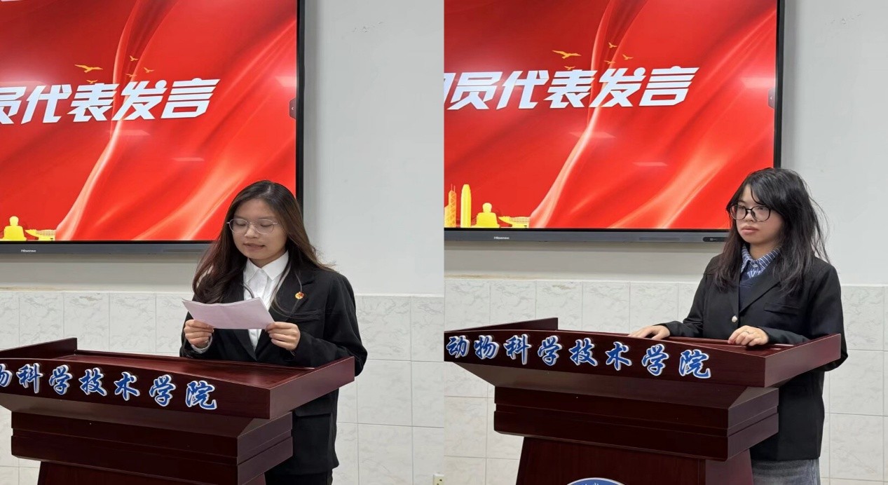 在随后的交流环节,团员代表向宴颉结合学习体会与实际观察,围绕“推动全会精神在学校落地生根”主题作了发言。她提出,作为动物科学技术学院的青年学子,应主动将专业学习与国家战略需求相对接,在科研创新与服务“三农”中践行全会精神,让理论学习真正转化为推动学科发展与学校建设的实际行动。