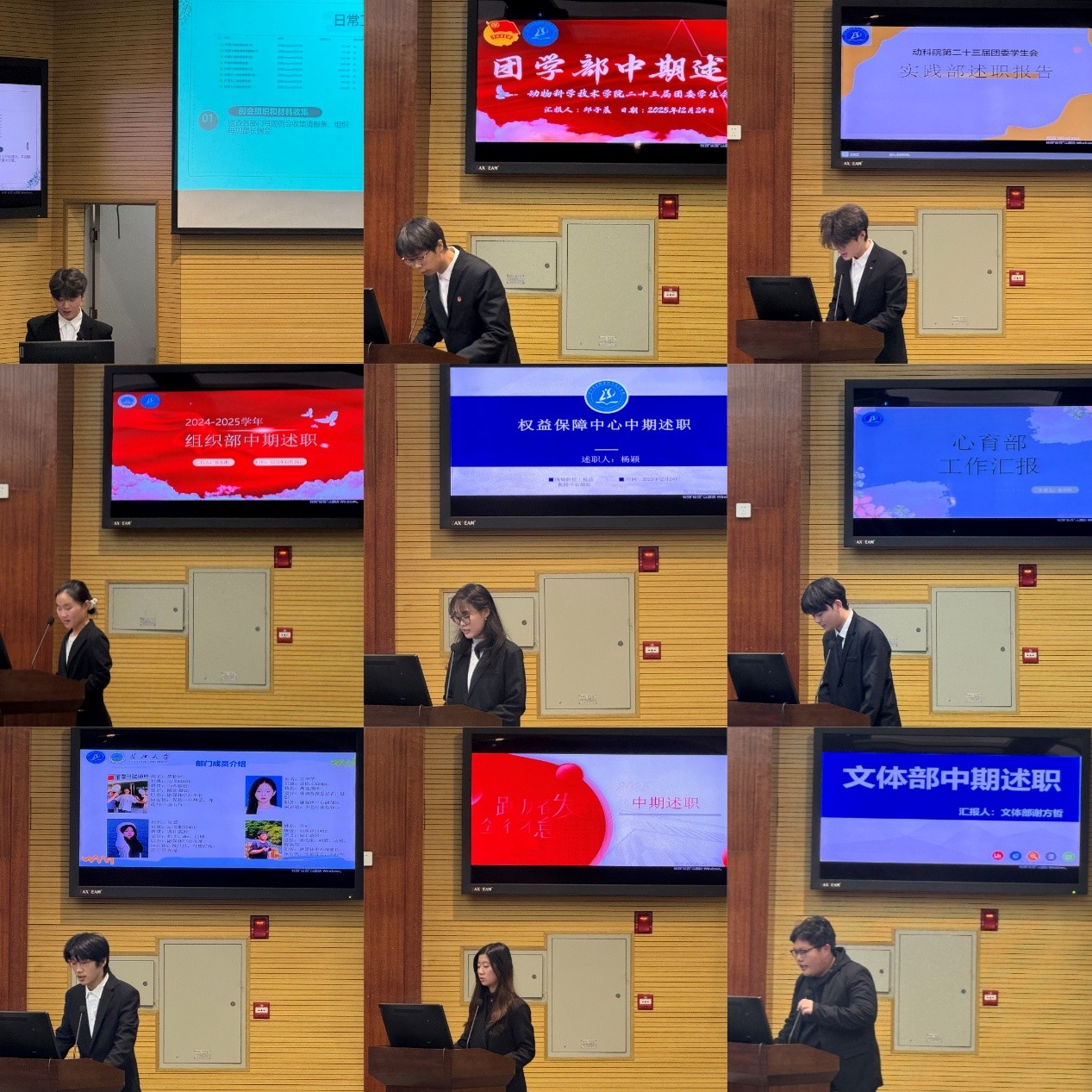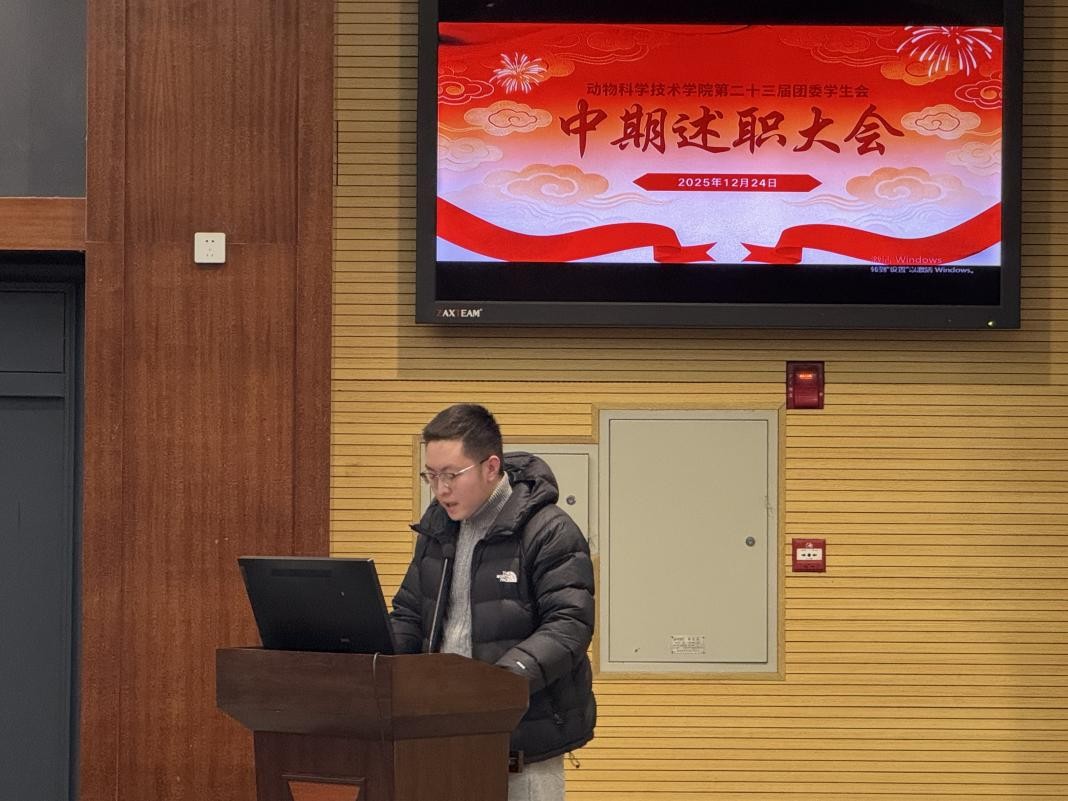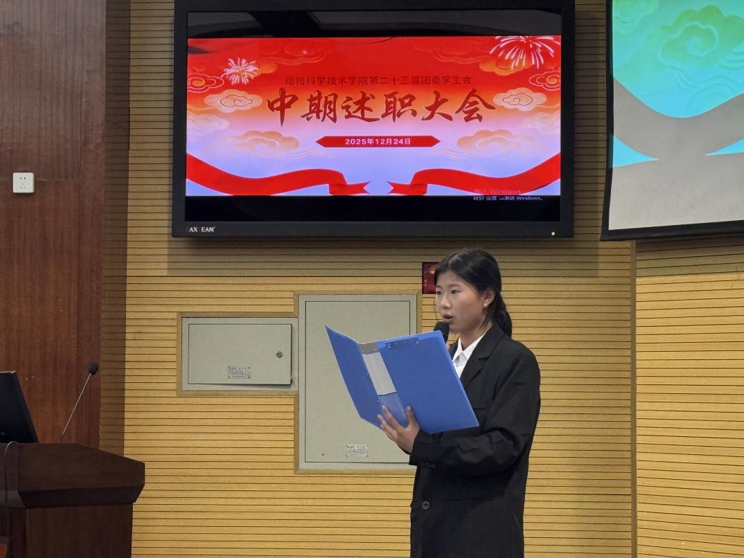 2025年12月24日晚七点,动科学院在农科大楼1056召开学生会中期述职大会,参加本次大会的有长江大学动物科学技术学院团委书记宋宇航老师,长江大学动物科学技术学院第二十三届学生会主席团和各部门部长与全体部员。会议旨在总结过去一学期的工作成果和经验教训,并规划未来的工作展望。